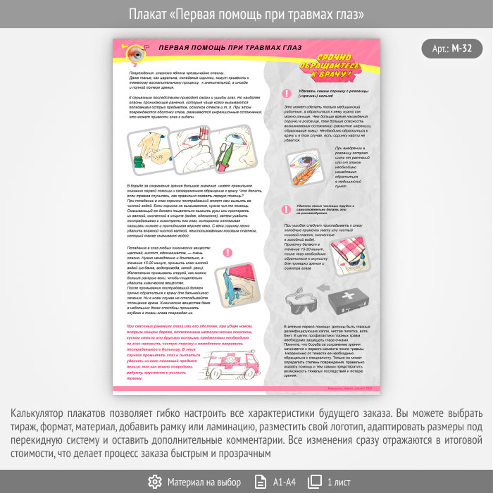 Плакат «Первая помощь при травмах глаз» (М-32, 1 лист) в Ачинске купить