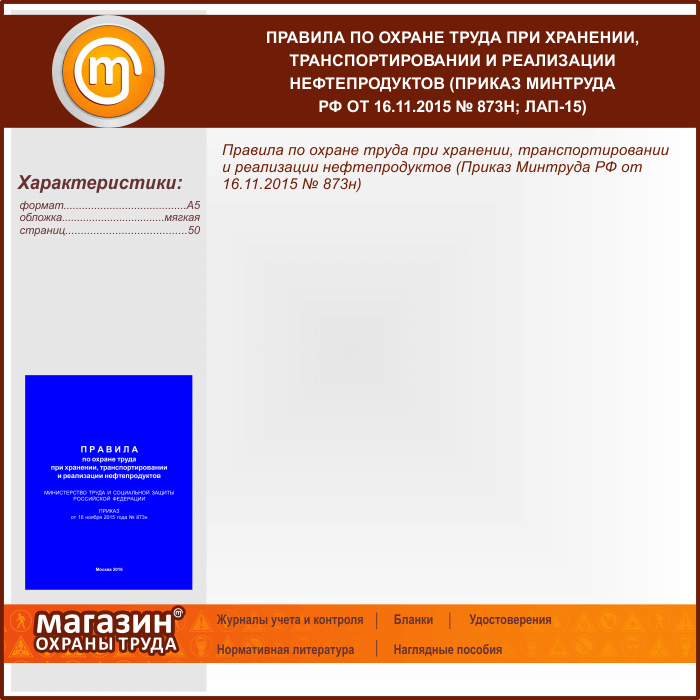 Правила по охране труда при хранении, транспортировании и реализации нефтепродуктов (Приказ Минтруда РФ от 16.11.2015 № 873н) (ЛАП-15) в Ачинске купить