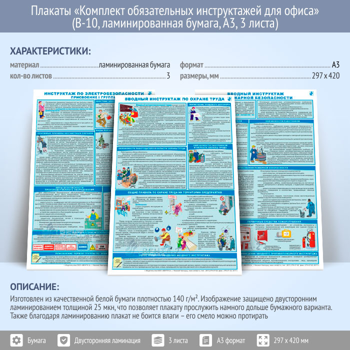 Плакаты «Комплект обязательных инструктажей для офиса» (В-10, ламинированная бумага, А3, 3 листа) в Ачинске купить