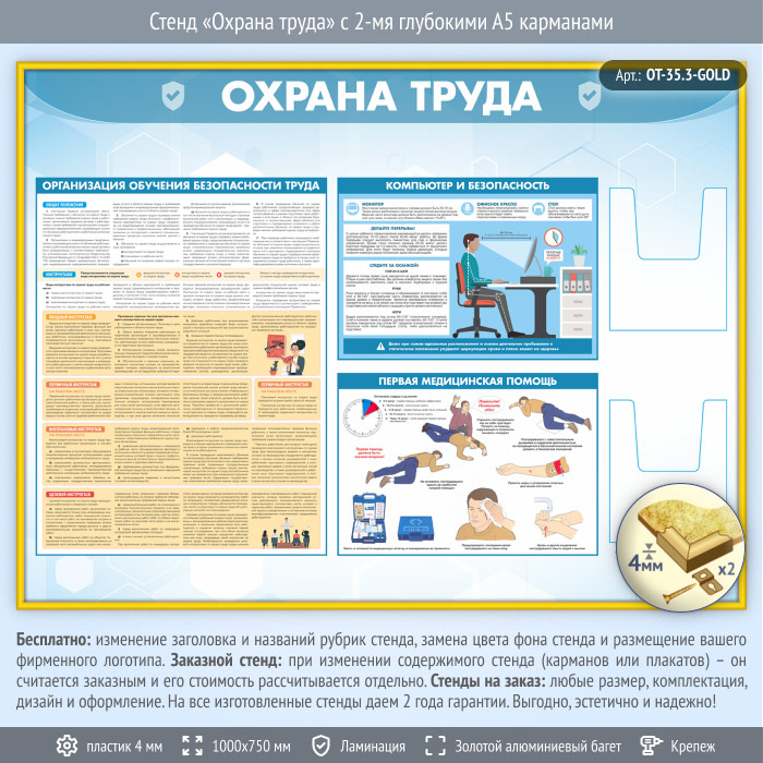 Стенд «Охрана труда» с 2-мя глубокими А5 карманами (OT-35.3-GOLD) в Ачинске купить