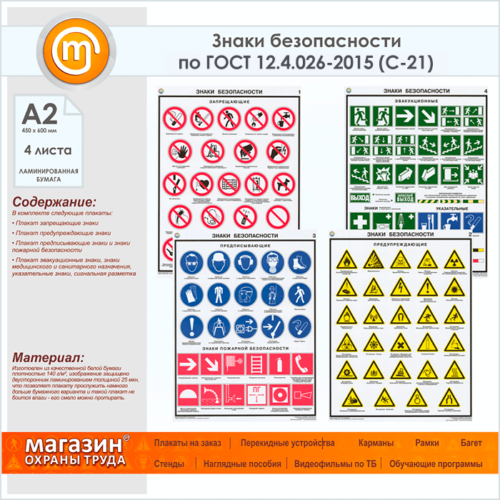 Плакаты «Знаки безопасности по ГОСТ 12.4.026-2015» (С-21, ламинированная бумага, А2, 4 листа) в Ачинске купить