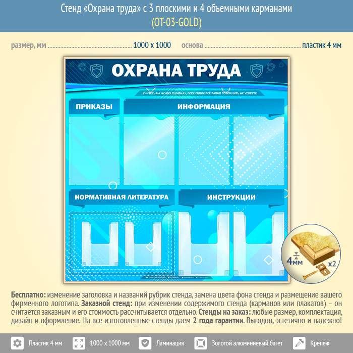 Стенд «Охрана труда» с 4 плоскими и 4 объемными карманами (OT-03-GOLD) в Ачинске купить