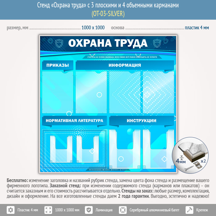 Стенд «Охрана труда» с 4 плоскими и 4 объемными карманами (OT-03-SILVER) в Ачинске купить