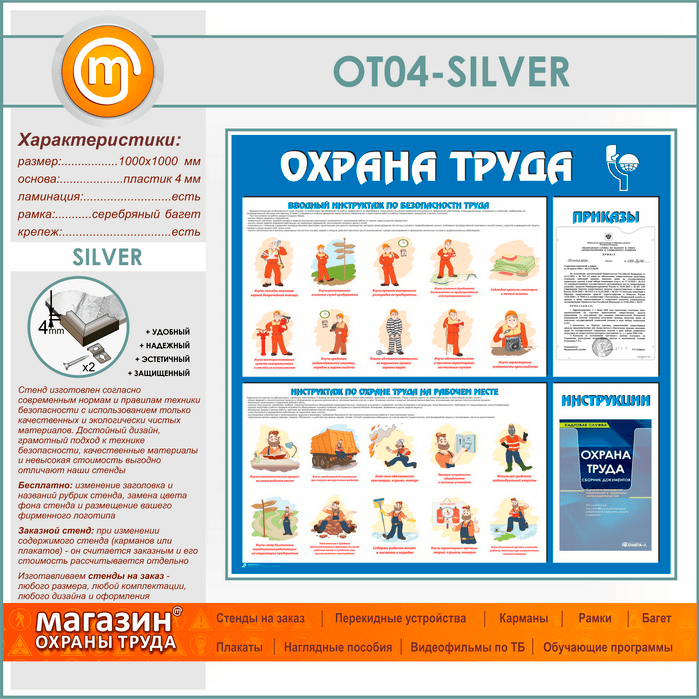 Стенд «Охрана труда» с плоским и объемным карманами (OT-04-SILVER) в Ачинске купить