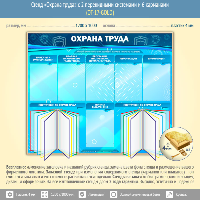Стенд «Охрана труда» с 2 перекидными системами и 6 карманами (OT-17-GOLD) в Ачинске купить