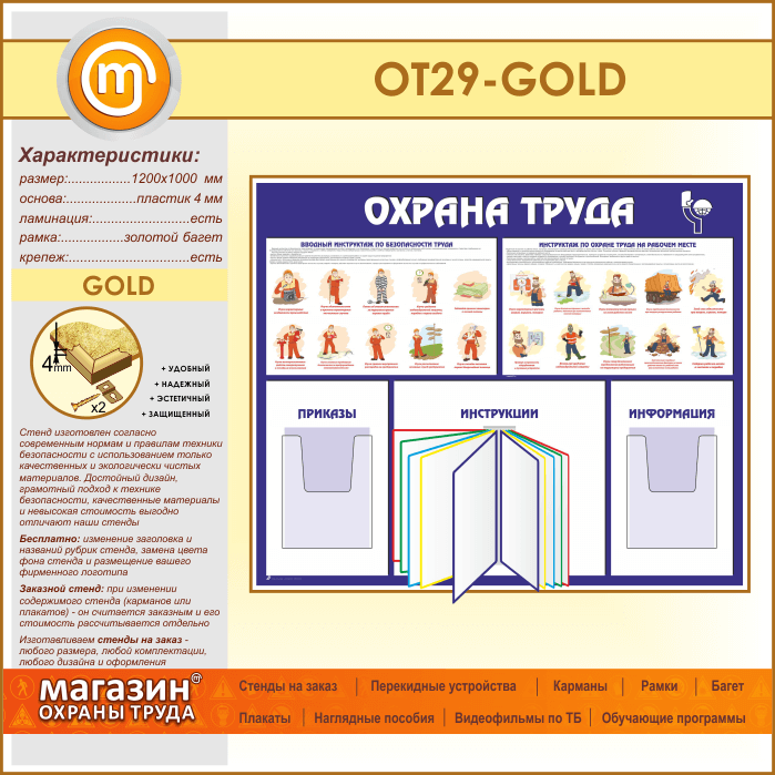 Стенд «Охрана труда» с перекидной системой и 2 объемными карманами (OT-29-GOLD) в Ачинске купить