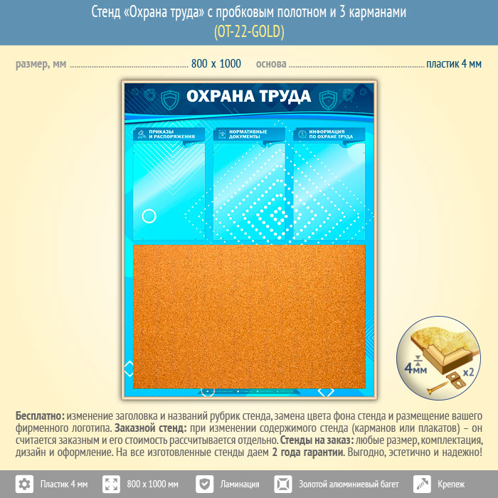 Стенд «Охрана труда» с пробковым полотном и 3 карманами (OT-22-GOLD) в Ачинске купить