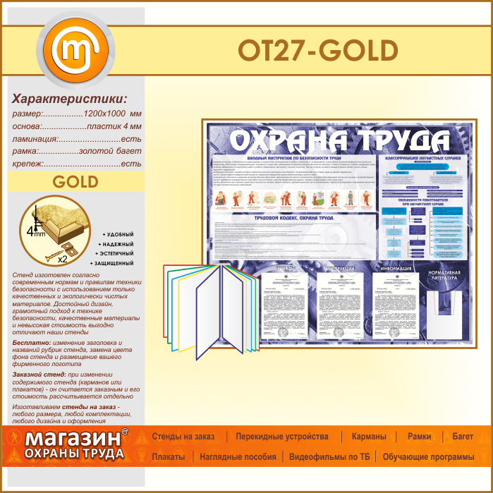 Стенд «Охрана труда» с перекидной системой, 3 плоскими и 1 объемным карманом (OT-27-GOLD) в Ачинске купить
