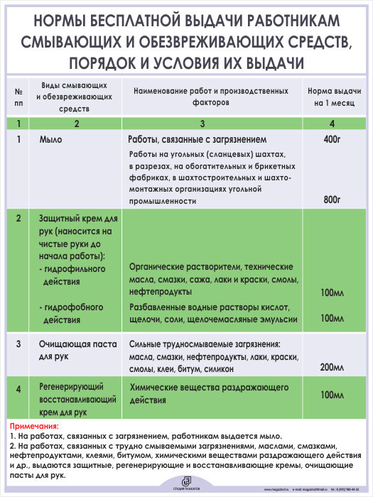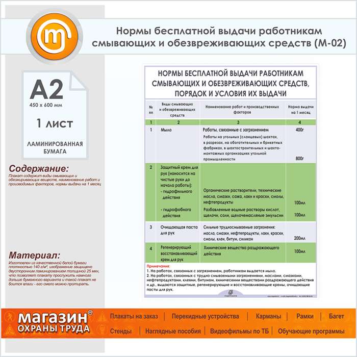 Плакат «Нормы бесплатной выдачи работникам смывающих и обезвреживающих средств» (М-02, ламинированная бумага, А2, 1 лист) в Ачинске купить