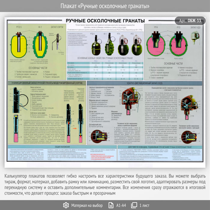 Плакат «Ручные осколочные гранаты» (ОБЖ-33, 1 лист) в Ачинске купить