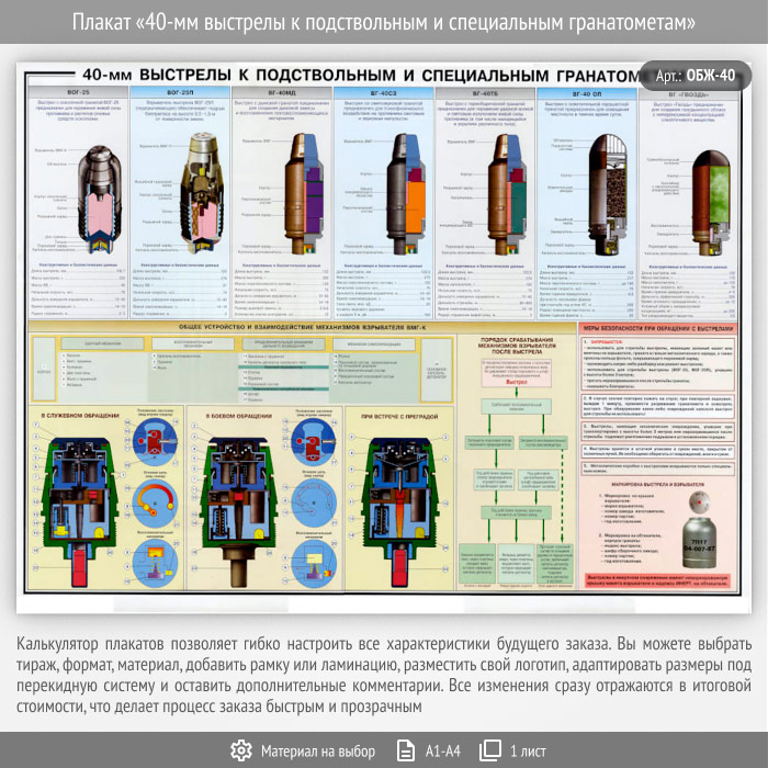 Плакат «40-мм выстрелы к подствольным и специальным гранатометам» (ОБЖ-40, 1 лист) в Ачинске купить