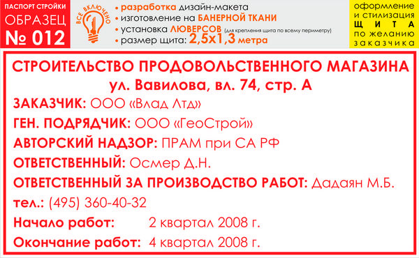 Паспорт стройки, образец № 12 (баннерная ткань, 2500х1300 cм) в Ачинске купить