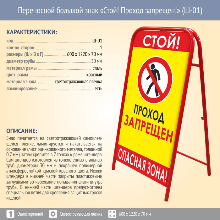Переносной большой знак «Стой! Проход запрещен!» (Ш-01, односторонний, светоотражающая пленка) в Ачинске купить