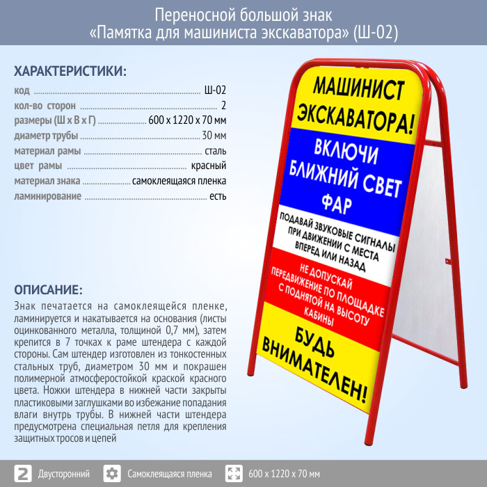 Переносной большой знак «Памятка для машиниста экскаватора» (Ш-02, двусторонний, самоклеящаяся пленка) в Ачинске купить