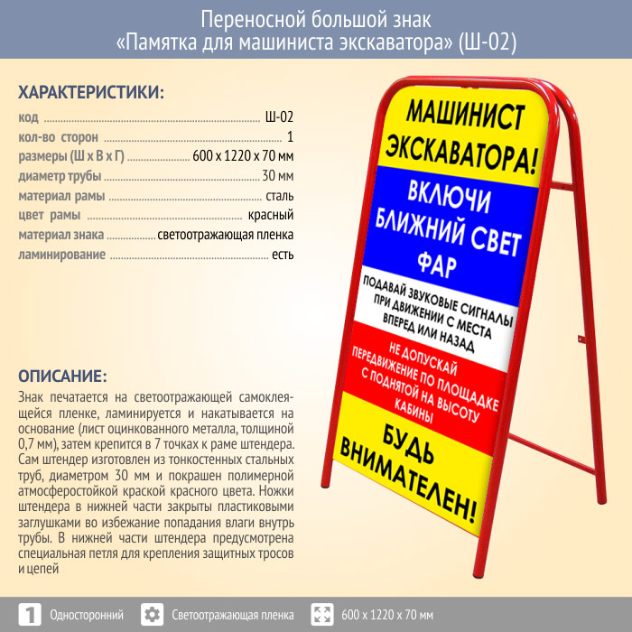 Переносной большой знак «Памятка для машиниста экскаватора» (Ш-02, односторонний, светоотражающая пленка) в Ачинске купить