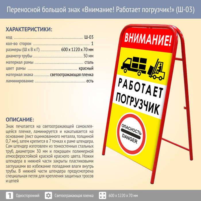 Переносной большой знак «Внимание! Работает погрузчик!» (Ш-03, односторонний, светоотражающая пленка) в Ачинске купить
