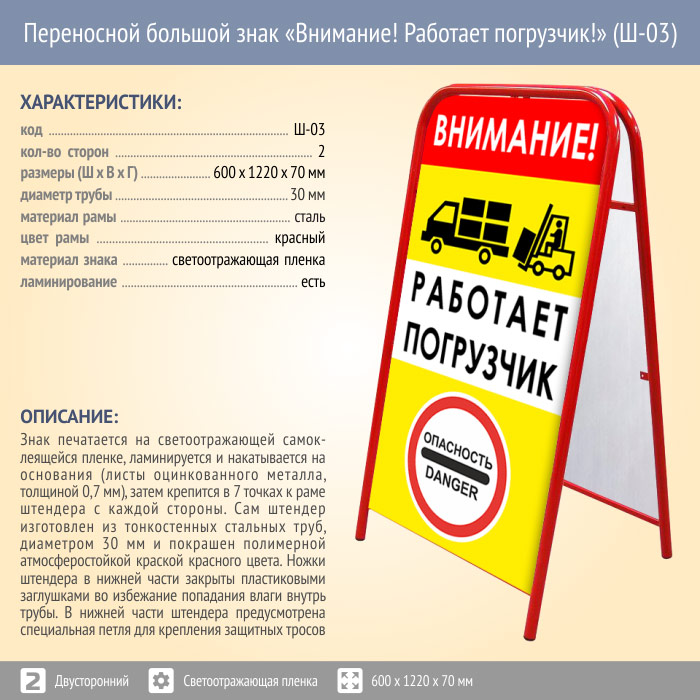 Переносной большой знак «Внимание! Работает погрузчик!» (Ш-03, двусторонний, светоотражающая пленка) в Ачинске купить