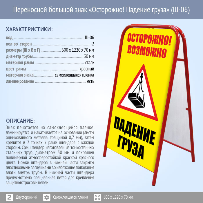 Переносной большой знак «Осторожно! Падение груза» (Ш-06, двусторонний, самоклеящаяся пленка) в Ачинске купить