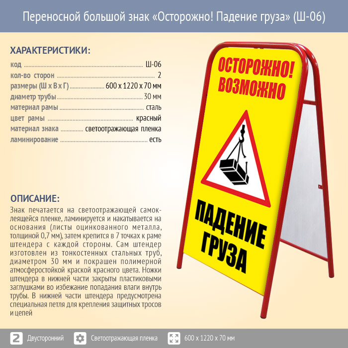 Переносной большой знак «Осторожно! Падение груза» (Ш-06, двусторонний, светоотражающая пленка) в Ачинске купить