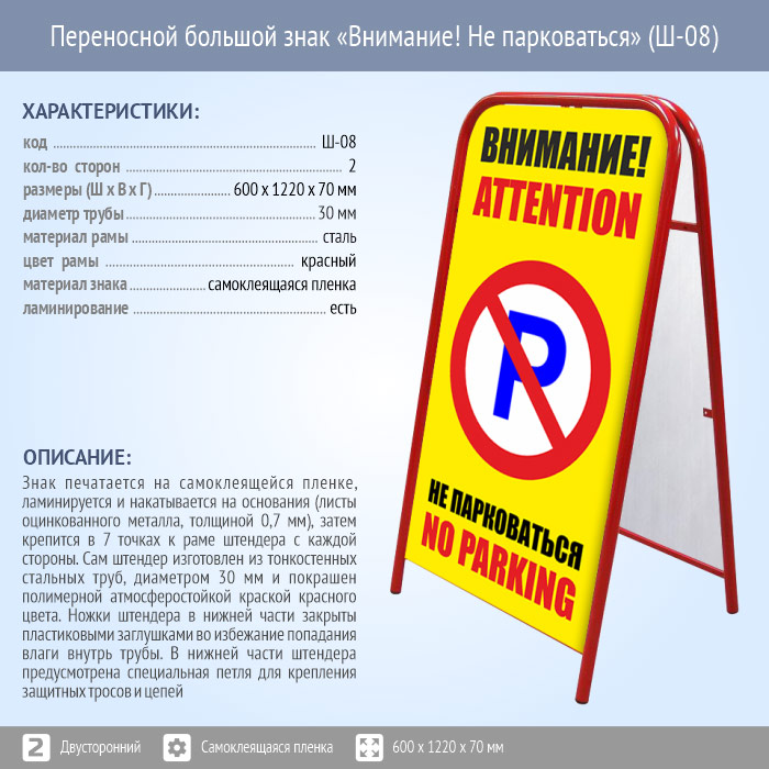 Переносной большой знак «Внимание! Не парковаться» (Ш-08, двусторонний, самоклеящаяся пленка) в Ачинске купить