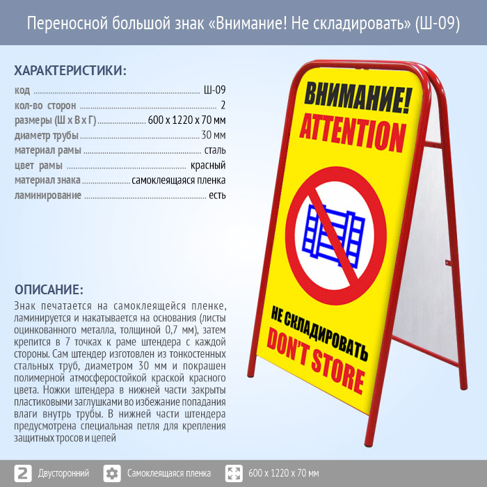 Переносной большой знак «Внимание! Не складировать» (Ш-09, двусторонний, самоклеящаяся пленка) в Ачинске купить