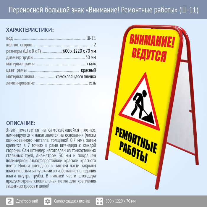 Переносной большой знак «Внимание! Ремонтные работы» (Ш-11, двусторонний, самоклеящаяся пленка) в Ачинске купить