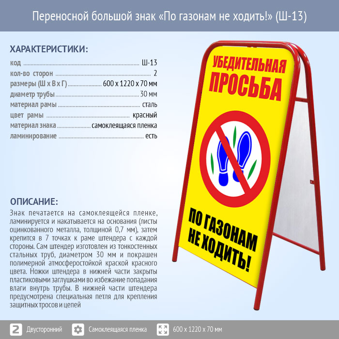 Переносной большой знак «По газонам не ходить!» (Ш-13, двусторонний, самоклеящаяся пленка) в Ачинске купить