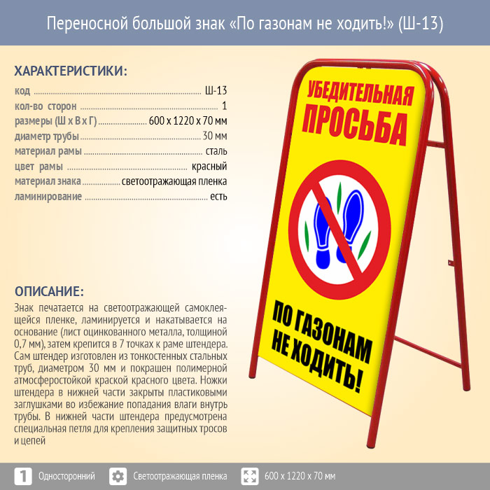 Переносной большой знак «По газонам не ходить!» (Ш-13, односторонний, светоотражающая пленка) в Ачинске купить