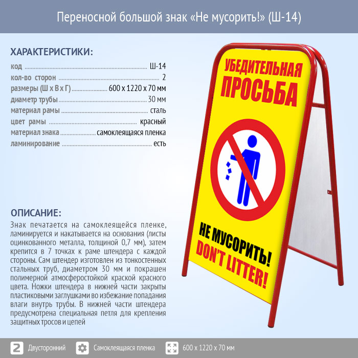 Переносной большой знак «Не мусорить!» (Ш-14, двусторонний, самоклеящаяся пленка) в Ачинске купить