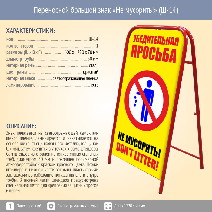 Переносной большой знак «Не мусорить!» (Ш-14, односторонний, светоотражающая пленка) в Ачинске купить