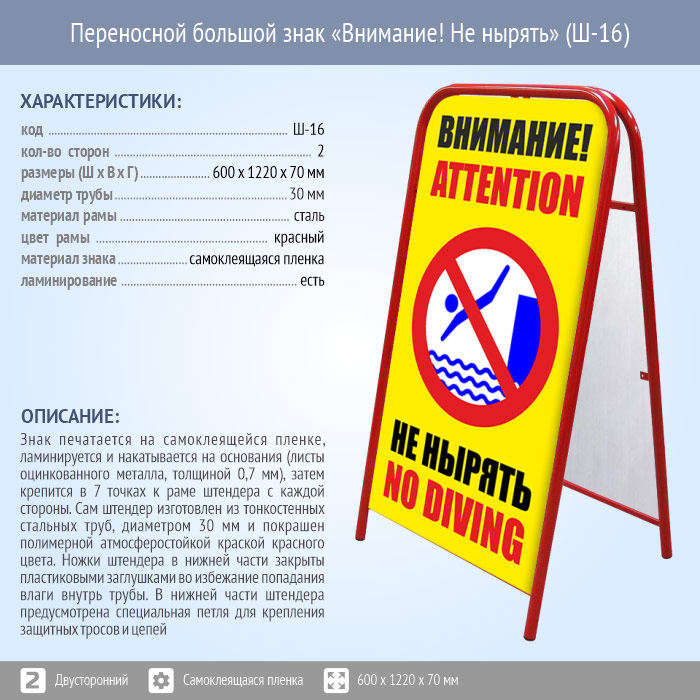 Переносной большой знак «Внимание! Не нырять» (Ш-16, двусторонний, самоклеящаяся пленка) в Ачинске купить