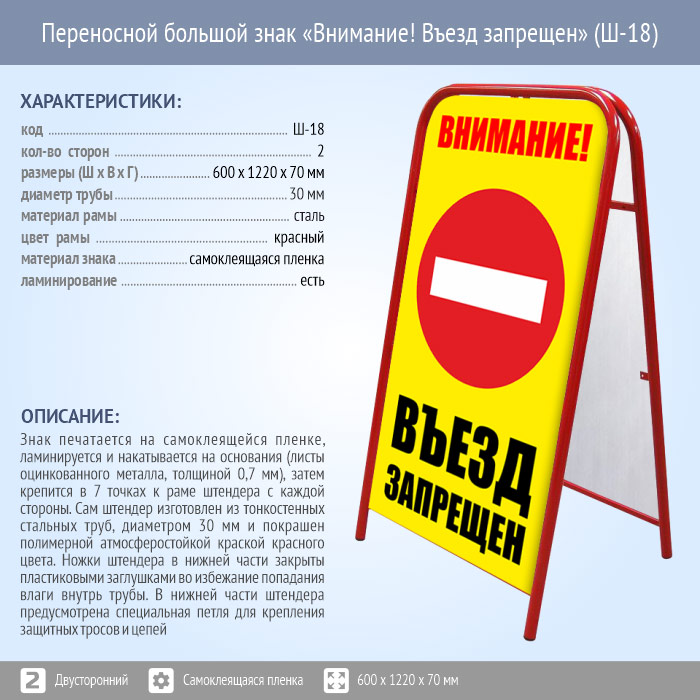 Переносной большой знак «Внимание! Въезд запрещен» (Ш-18, двусторонний, самоклеящаяся пленка) в Ачинске купить