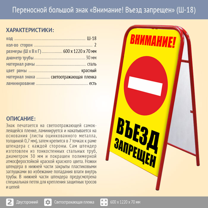 Переносной большой знак «Внимание! Въезд запрещен» (Ш-18, двусторонний, светоотражающая пленка) в Ачинске купить