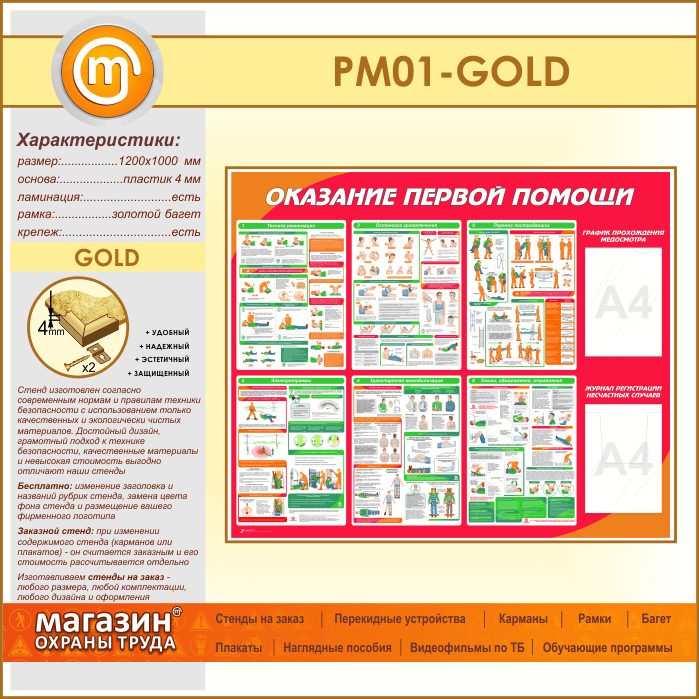 Стенд «Оказание первой помощи» с плоским и объемным карманами (PM-01-GOLD) в Ачинске купить