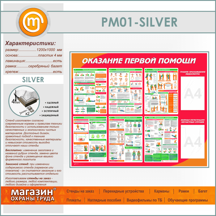 Стенд «Оказание первой помощи» с плоским и объемным карманами (PM-01-SILVER) в Ачинске купить
