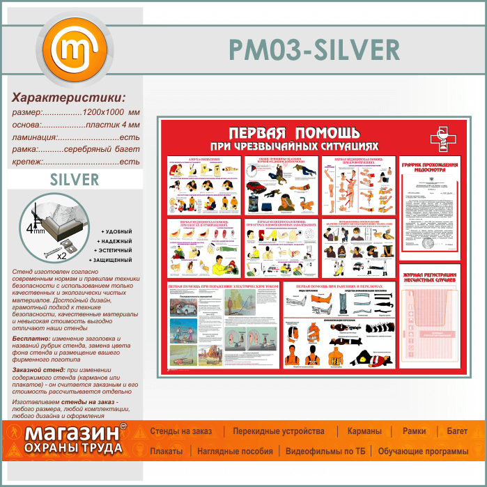 Стенд «Первая помощь при чрезвычайных ситуациях» с плоским и объемным карманами (PM-03-SILVER) в Ачинске купить