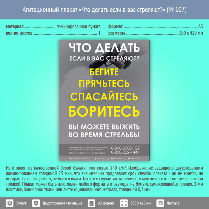 Плакат «Что делать если в вас стреляют?» (М-107, ламинированная бумага, А3, 1 лист) в Ачинске купить