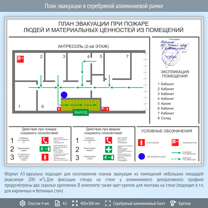 План эвакуации в серебряной алюминиевой рамке (А3 формат) в Ачинске купить