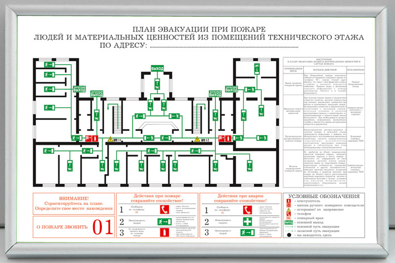 МАЛОИСПОЛЬЗУЕМЫЙ ФОРМАТ малоиспользуемый формат. Подходит для изготовления схем однокомнатных (максимум трехкомнатных) помещений. Содержит схематичное изображение помещения с размещенными на нем средствами пожаротушения, путями эвакуации и условные обозначения. НЕ МОЖЕТ содержать инструкцию и действия при пожаре |
