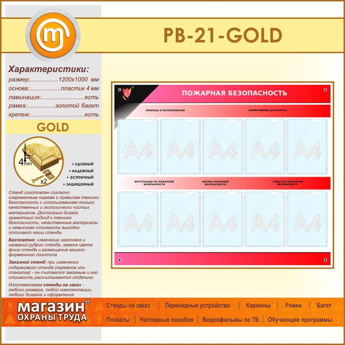Стенд «Пожарная безопасность» с 10 карманами (PB-21-GOLD) в Ачинске купить