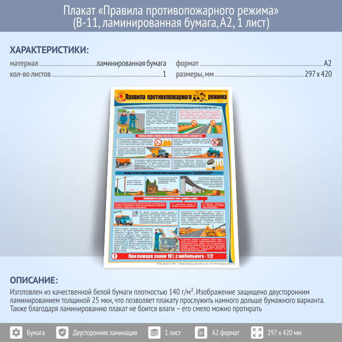 Плакат «Правила противопожарного режима» (В-11, ламинированная бумага, А2, 1 лист) в Ачинске купить