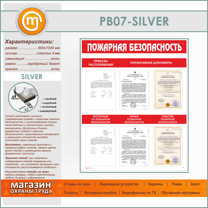 Стенд «Пожарная безопасность» с 6 карманами (PB-07-SILVER) в Ачинске купить
