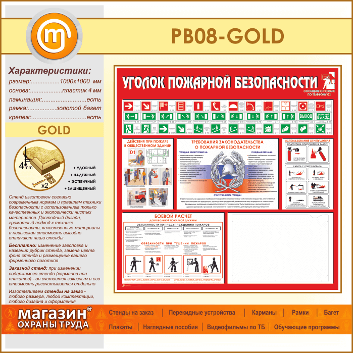 Стенд «Уголок пожарной безопасности» с карманом А3 формата (PB-08-GOLD) в Ачинске купить