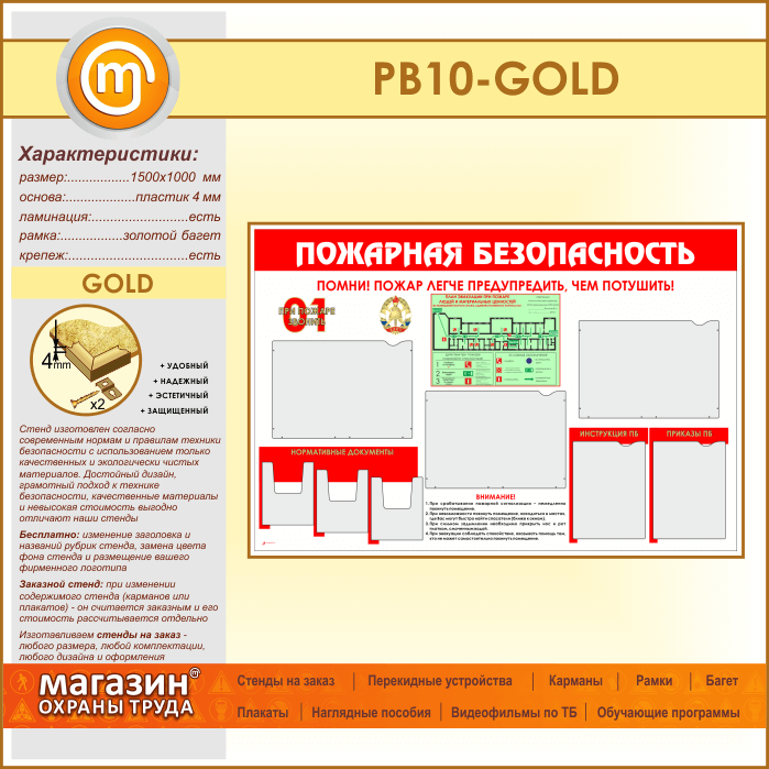Стенд «Пожарная безопасность» с планом эвакуации, 5 плоскими и 3 объемными карманами (PB-10-GOLD) в Ачинске купить