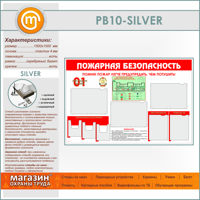 Стенд «Пожарная безопасность» с планом эвакуации, 5 плоскими и 3 объемными карманами (PB-10-SILVER) в Ачинске купить