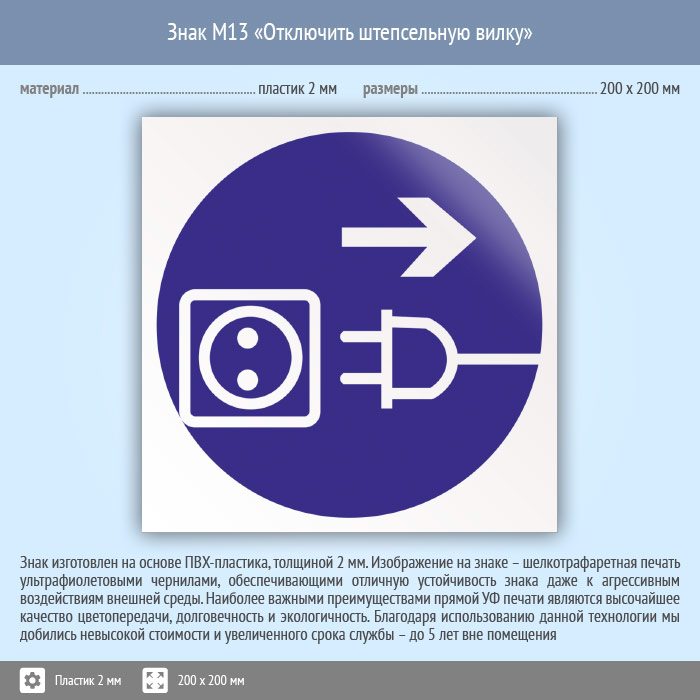 Знак M13 «Отключить штепсельную вилку» (пластик, 200х200 мм) в Ачинске купить