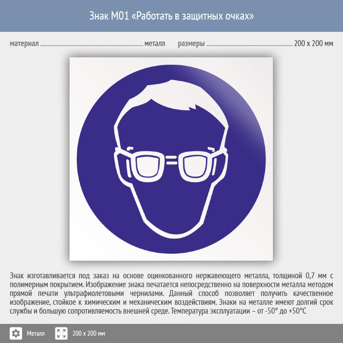 Знак M01 «Работать в защитных очках» (металл, 200х200 мм) в Ачинске купить