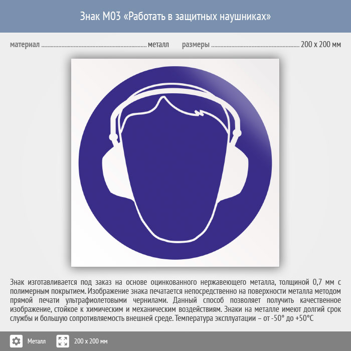Знак M03 «Работать в защитных наушниках» (металл, 200х200 мм) в Ачинске купить
