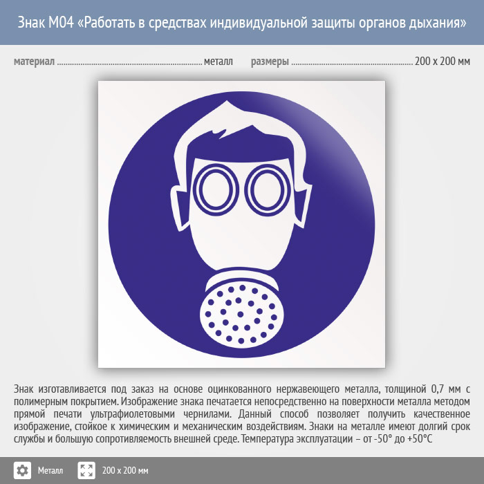 Знак M04 «Работать в средствах индивидуальной защиты органов дыхания» (металл, 200х200 мм) в Ачинске купить