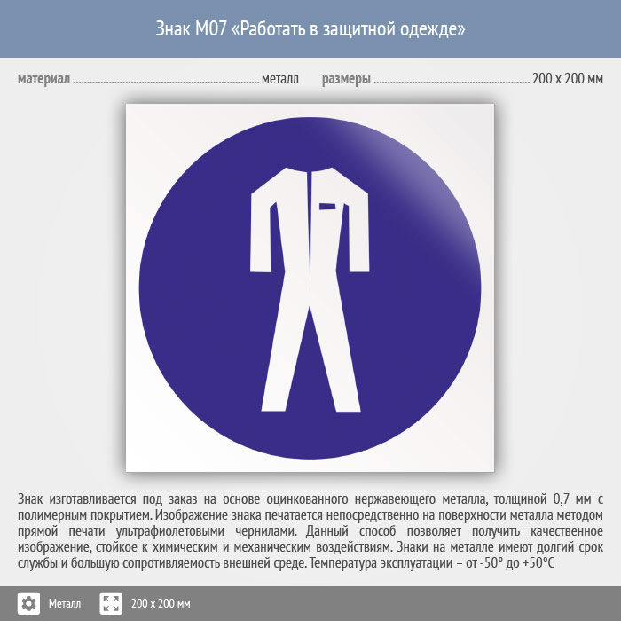 Знак M07 «Работать в защитной одежде» (металл, 200х200 мм) в Ачинске купить